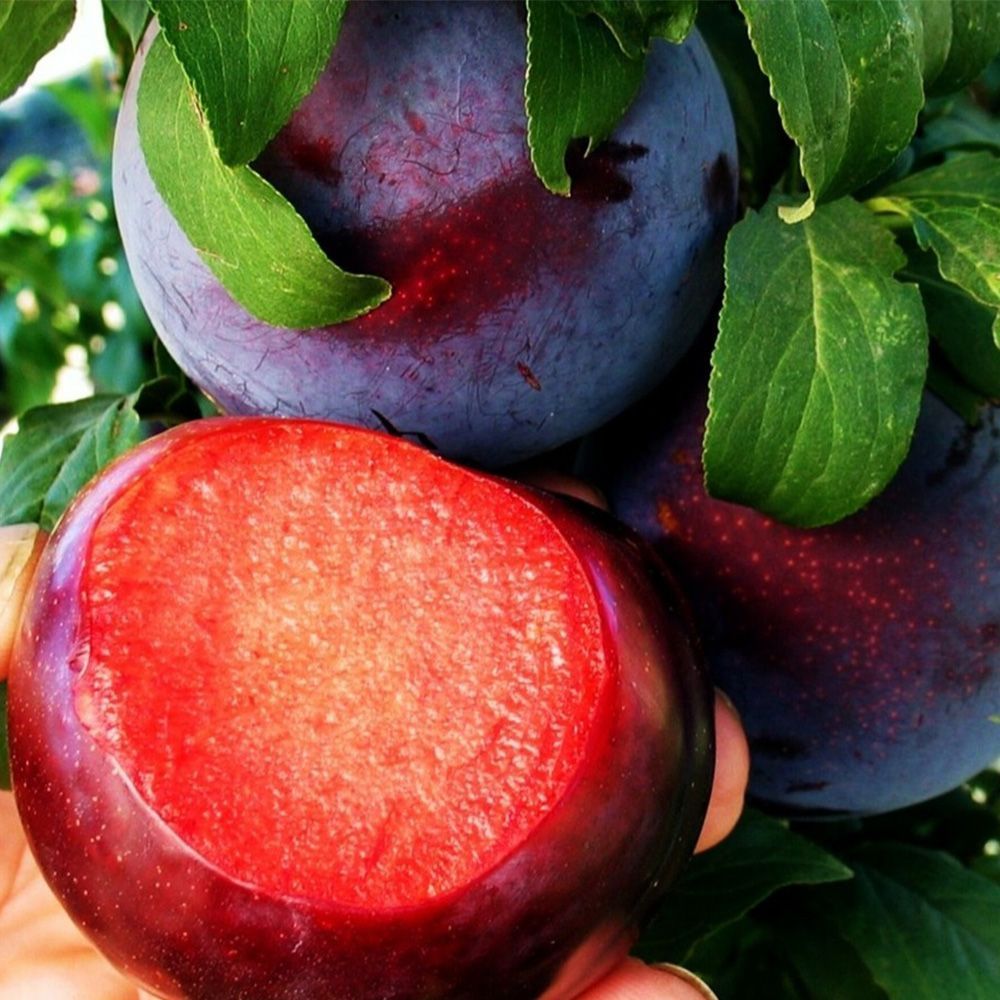 • Плоди: великі (70–90 г), округлої або трохи овальної форми, темно-фіолетові майже чорні, з глянцевим блиском і щільним восковим нальотом. М’якуш щільний, золотисто-жовтий або жовто-оранжевий, дуже солодкий, з легкою приємною кислинкою. Кісточка відділяється частково.